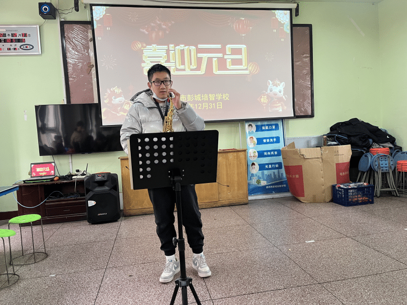 自立班相声三句半精彩纷呈,团结班郑同学萨克斯独奏《新年好》、《苹果香》充满文艺风,自理班乐器大鼓和小鼓韵律感十足。